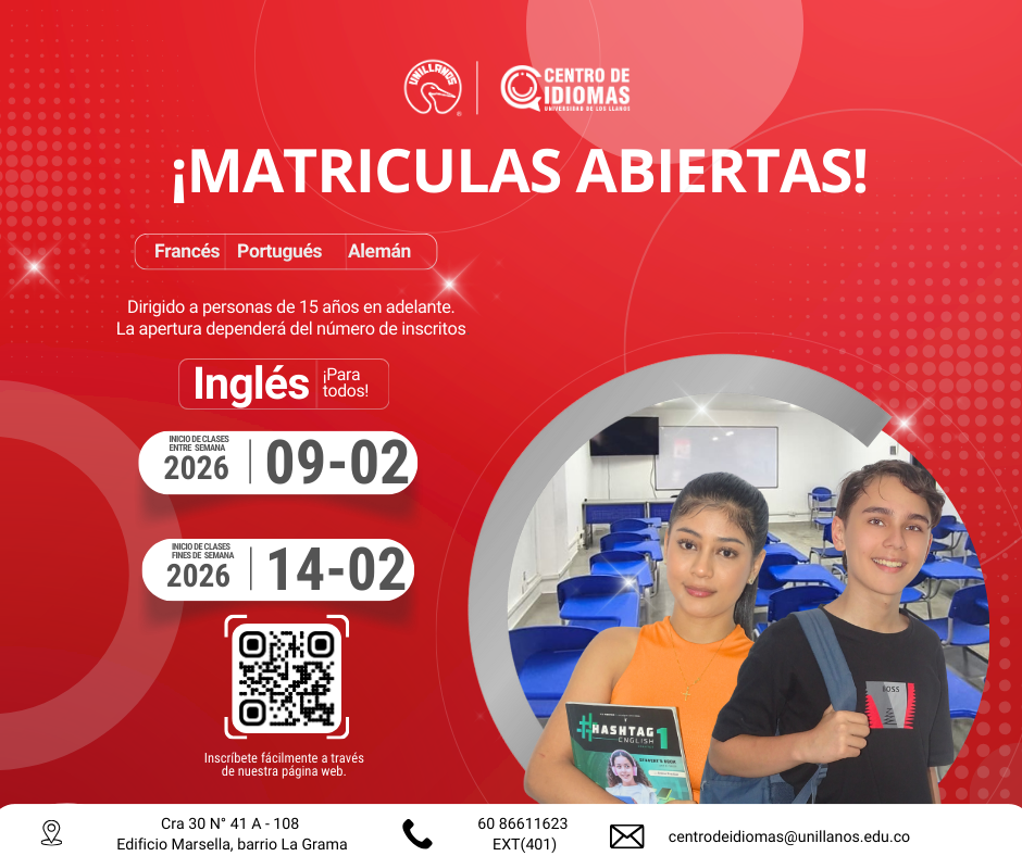 El Centro de Idiomas de la Universidad de los Llanos informa a la comunidad que ya se encuentran abiertas las matrículas para los programas de idiomas.